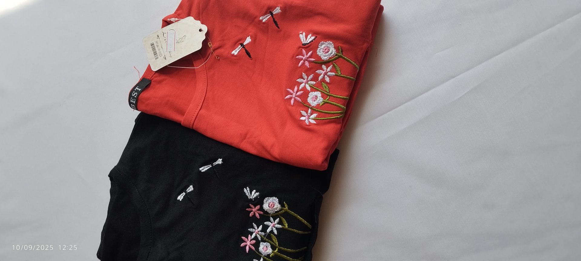 تیشرت لینا🌻 جنس کار: ویسکوز درجه یکه قدکار:65 رو جیبش گلدوزیش فشرده اس رنگ بندی کار : فقط مشکی و قرمزه قیمت کار:198